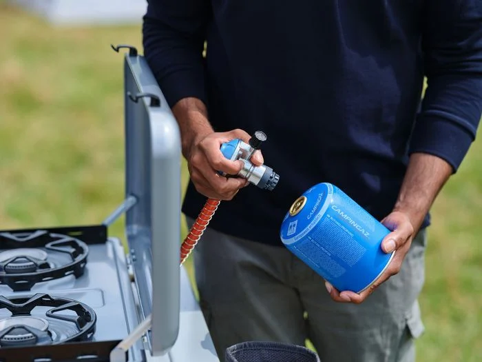 Met de inbegrepen slang en drukregelaar, die al aan het kooktoestel zijn bevestigd, en de Easy Clic PLUS-aansluiting, kun je snel en gemakkelijk een gascartouche aansluiten of loskoppelen, waardoor het Campingaz Camping Kitchen 2 Maxi CV kooktoestel een handige en betrouwbare keuze is voor al je kampeeravonturen. De Camping Kitchen Maxi CV is geschikt voor de wegwerpblikjes van Campingaz.Â