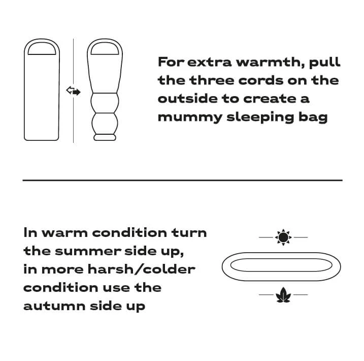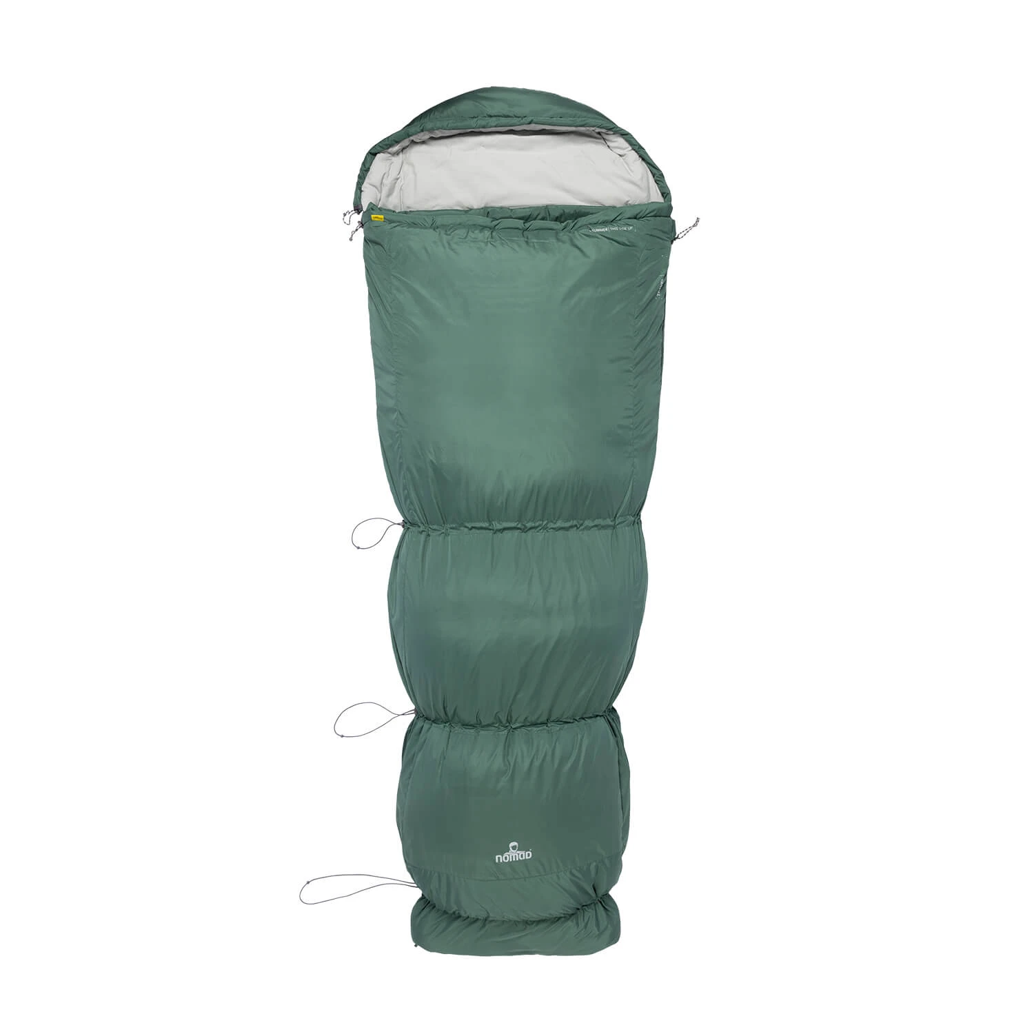 De Nomad Slaapzak Triple-S Premium is een 3-seizoenenslaapzak. De slaapzak heeft een mummy-model, maar is ook helemaal open te ritsen tot een deken. Ideaal dus! Ook heeft de slaapzak twee verschillende zijdes. Een zomer- en een herfstkant. Je kunt de slaapzak gewoon omdraaien om van kant te verwisselen. In de links boven in de hoek staat om welke kant het gaat. De slaapzak heeft een capuchon die je eraf kan ritsen. De comforttemperatuur bij deze slaapzak is -2 graden voor de man en 4 graden voor de vrouw.Â