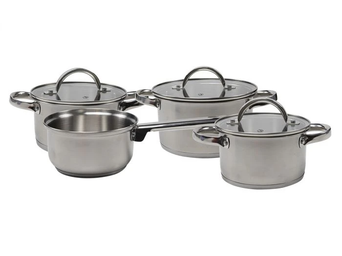 Deze 7-delige pannenset bestaat uit 3 kookpannen, 1 steelpan en 3 deksels. Deze set is perfect voor als je verschillende maaltijden gaat maken. Met deze set heb je altijd de juiste pan met het passende formaat. De pannen zijn geschikt voor gas, elektrisch, keramisch, inductie en halogeen. Het materiaal van de pannen is roestvrijstaal.
